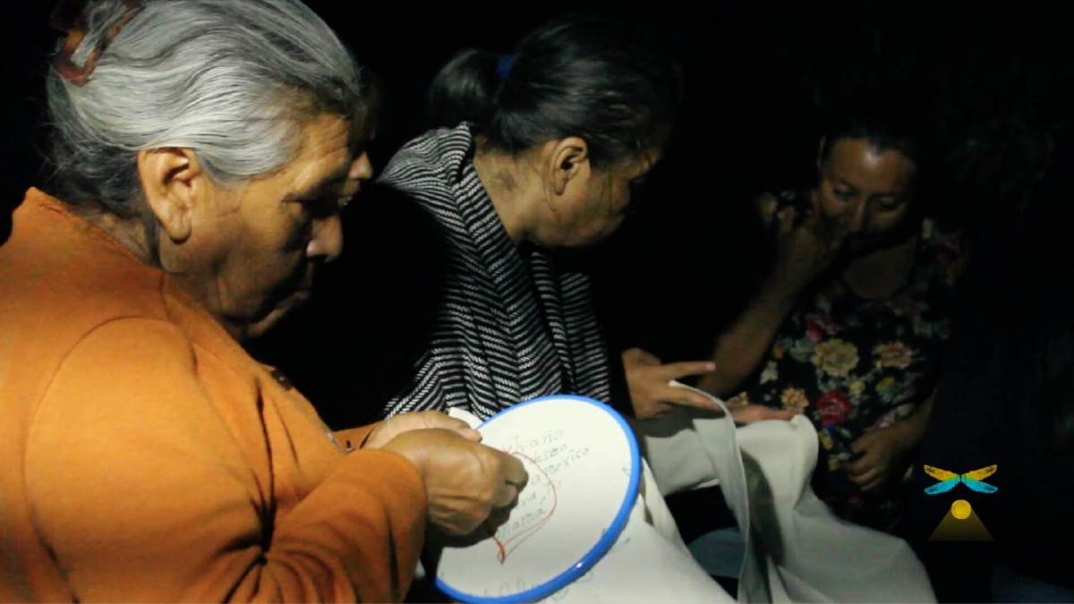 Como parte de las acciones de mediación cultural, mujeres de la comunidad bordaron mensajes dirigidos a familiares que han tenido que migrar, mientras disfrutaban de la proyección de una película mexicana.
