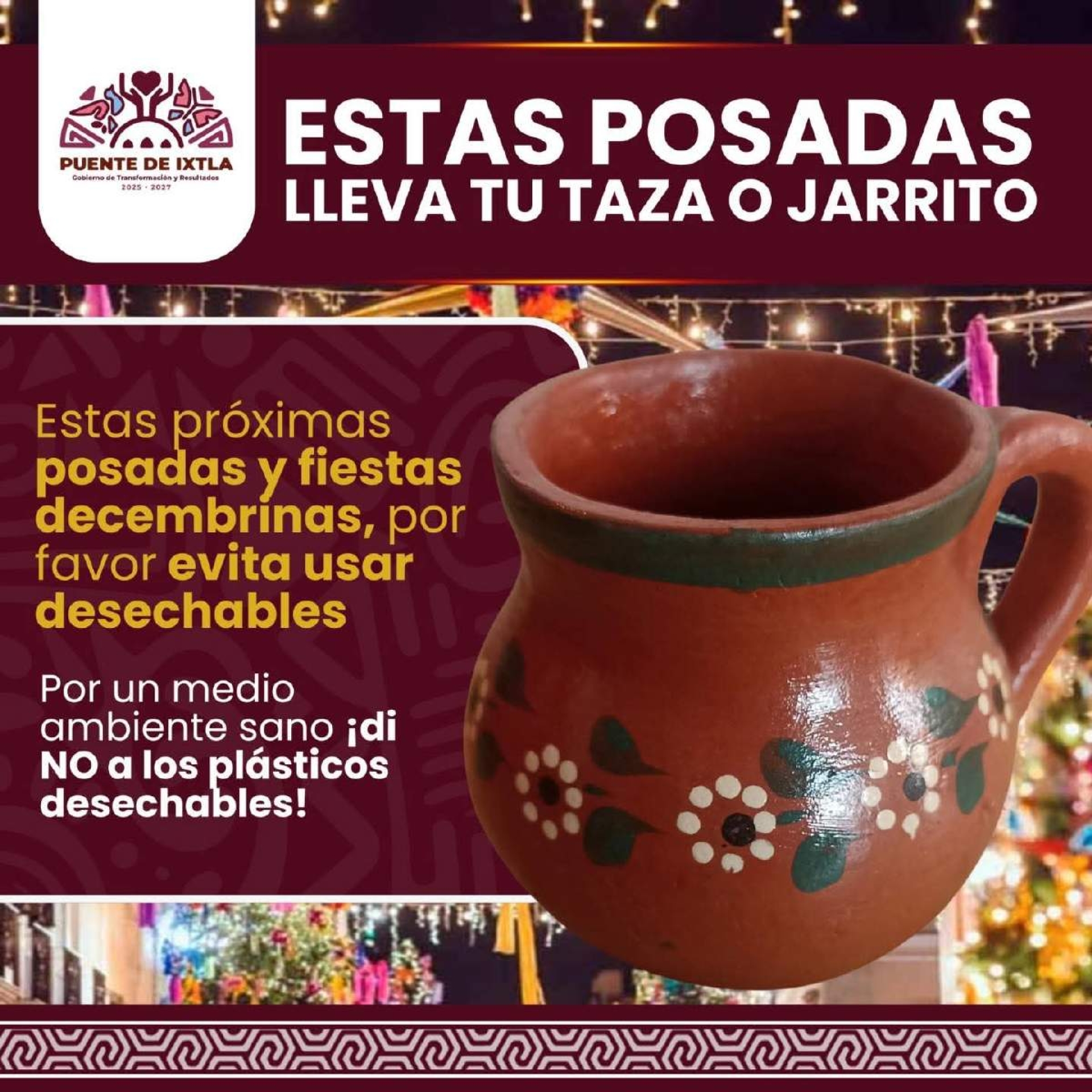 Puente de Ixtla.- La Dirección de Sustentabilidad Ambiental de este municipio promueve entre la población evitar el uso de unicel y plásticos de un solo uso durante las posadas y celebraciones navideñas, con el objetivo de reducir la afectación al medio ambiente.