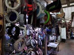 Los artículos a la venta en los locales 41 y 42 del mercado municipal Benito Juárez de Jojutla, son de primera calidad: huaraches, cinturones y accesorios para charrería y caballos, como frenos, estribos, riendas, cinchos, chicotes, cabestros, cabezadas, bridas, bozales, reatas, arzones, monturas, espuelas, polainas, chaparreras, etcétera.