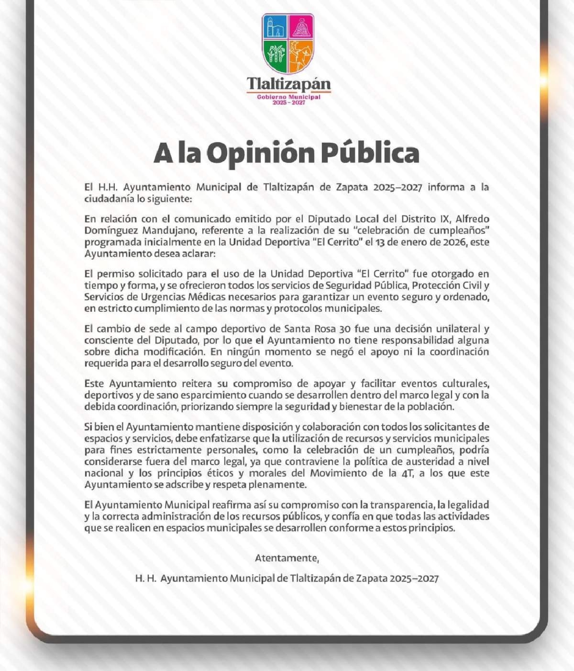“Debe enfatizarse que la utilización de recursos y servicios municipales para fines estrictamente personales, como la celebración de su cumpleaños, podría considerarse fuera del marco legal, ya que contraviene la política de austeridad a nivel nacional y los principios éticos y morales del movimiento de la 4T, a los que este ayuntamiento se adscribe y respeta”.