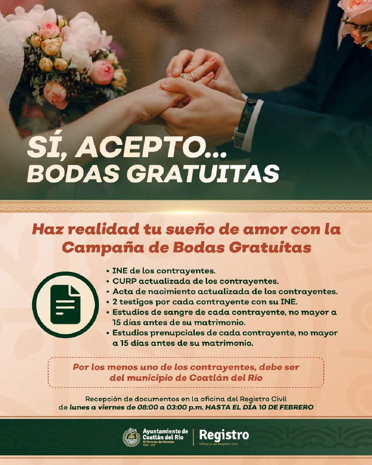 En Coatlán del Río, las bodas gratuitas también se efectuarán el 13 de febrero. Las parejas interesadas tienen como fecha límite el 10 de febrero para presentar su documentación correspondiente.