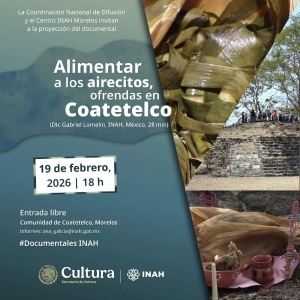 Coatetelco.- El Centro del Instituto Nacional de Antropología e Historia (INAH) Morelos llevará a cabo la proyección del documental “Alimentar a los airecitos, ofrendas en Coatetelco”, una producción que ofrece una mirada profunda a las tradiciones y rituales que mantienen viva la memoria cultural en el estado.