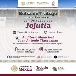 Jojutla.- El Ayuntamiento de este municipio lanzó una invitación a todas las personas con discapacidad a participar en la Bolsa de Trabajo, donde empresas de la región estarán realizando reclutamiento directo.