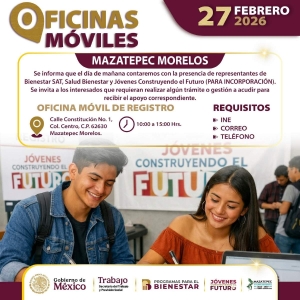 Mazatepec.- Este viernes 27 de febrero, vecinos de este municipio tendrán la oportunidad de realizar trámites y gestiones de diversos programas del gobierno federal desde una oficina móvil instalada en la calle Constitución número 1, Colonia Centro.