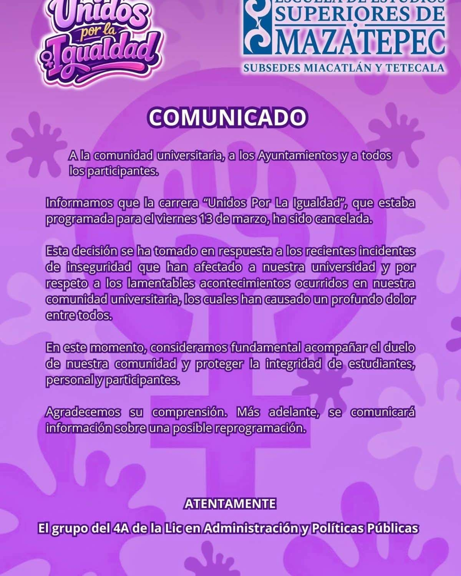 Mazatepec.- La Escuela de Estudios Superiores (EES) de Mazatepec, dependiente de la Universidad Autónoma del Estado de Morelos (UAEM), informó la cancelación de la carrera “Unidos por la Igualdad”, programada para este viernes 13 de marzo, ante el clima de inseguridad y en respeto a los recientes acontecimientos que han afectado a la comunidad universitaria.