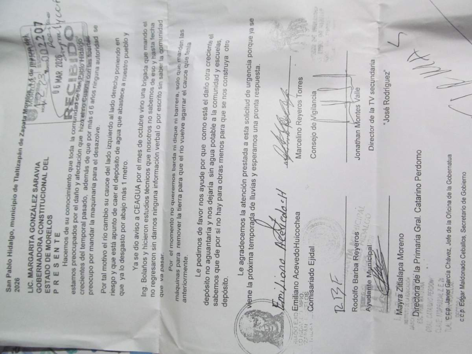 En un comunicado hecho llegar a esta Redacción, fechado el 4 de marzo y dirigido al gobierno del estado, el comité ejidal hace patente su inquietud porque el caudal del río Cuautla, en su paso por la comunidad, está erosionando la base del depósito de agua, debido a que cambió de cauce.