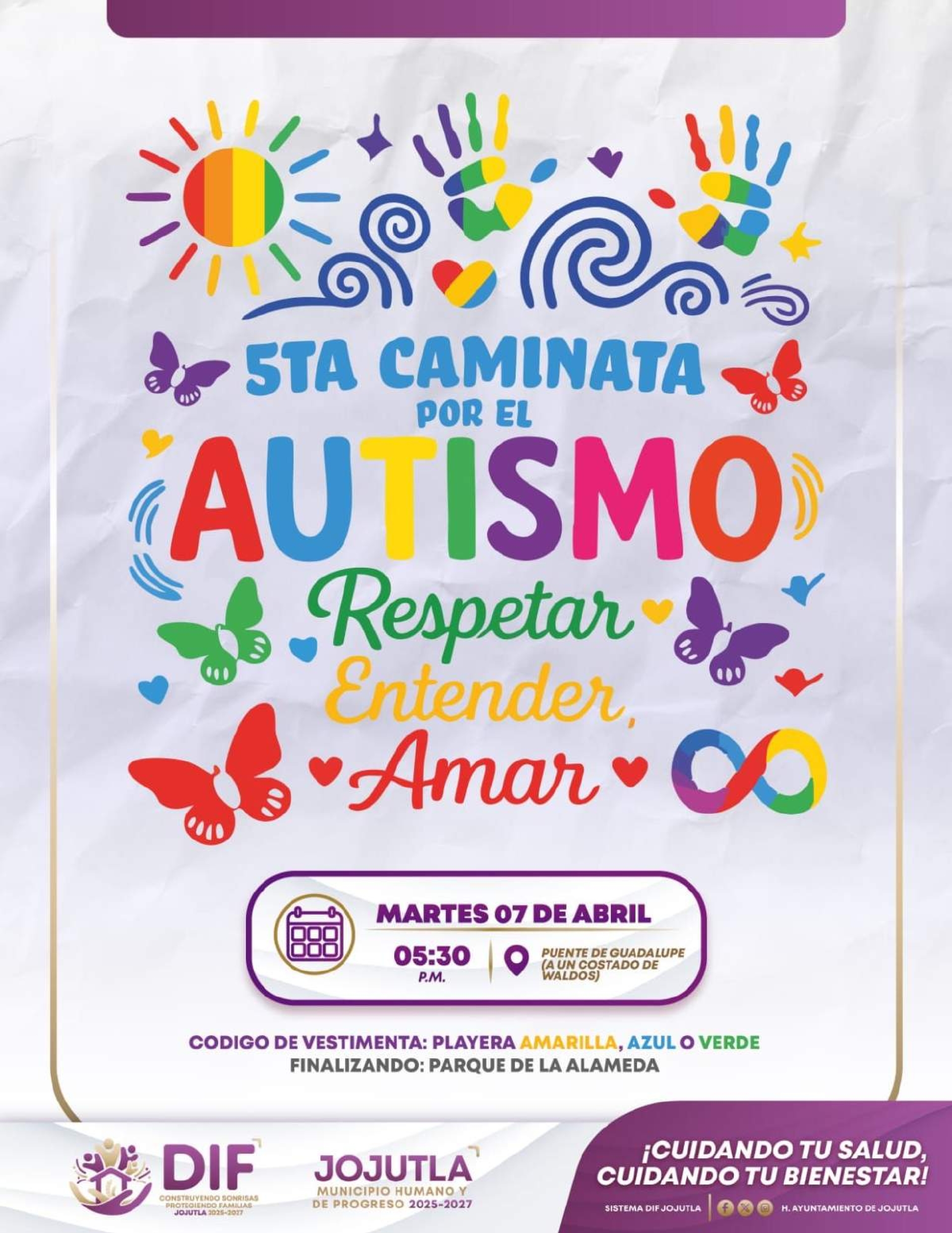 Jojutla.- El Sistema para el Desarrollo Integral para la Familia (DIF) municipal de este lugar convocó a la población a la quinta caminata por el autismo, a realizarse este martes 7 de abril, a las 5:30 pm.